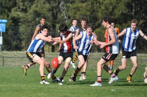 The 1st quarter was an even contest with neither side really dominating the play. Sam Adams was again great in the ruck, with the midfield division of Jeramey Edwards, Dan Osarek, and Tristan Kilpatrick working hard to get the Tigers first use of the footy. There was a downer early with Alex Page going down with a groin injury after only 2 mins. After he came off it was decided that he was done for the day. Francis Burns was doing a great job on the St Eddies full forward who was the leading goal kicker for the 2011 Season in the Under 16 Div 2 comp, and Brad Murphy was allowed to roam loose across half back and was influencing the play. At the end of the first quarter the scores were QBN/Goulburn Tigers 3.3.21 to St Edmund’s Blue 1.0.6